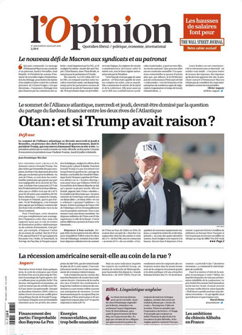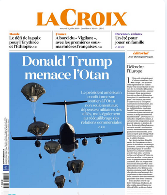 Au moment où Donald Trump décolle de Washington pour l’Europe, le Washington Post écrit que M. Trump semble s’être affranchi ces dernières semaines de la stratégie diplomatique traditionnelle de son entourage et avoir opté pour une rhétorique qu’il affectionne particulièrement, la provocation. Les Européens redoutent un désengagement américain en Europe pour ne pas « provoquer » la Russie. Le journal se demande « si l’OTAN survivra à Trump » ! Le sommet de l’OTAN est en effet l’autre grand risque de la fin de la semaine.