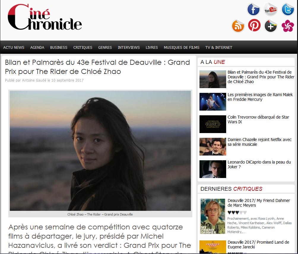 J’emprunte à l’excellent site Ciné Chronicle (http://www.cinechronicle.com/2017/09/bilan-palmares-43e-festival-de-deauville-113905/) l’article d’Antoine Gaudé, publié ce matin 10 septembre 2017, intitulé « Bilan et Palmarès du 43e Festival du film américain de Deauville : Grand Prix pour The Rider de Chloé Zhao, l’incroyable A Ghost Story de David Lowery multirécompensé », que je reproduis ci-dessous sur ce blog.