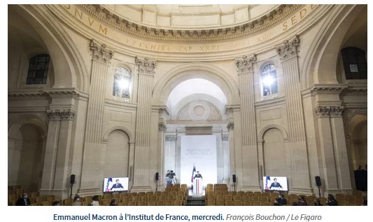 Sous la coupole de l’Institut de France, Emmanuel Macron a clairement affirmé sa « volonté de ne rien céder à ceux qui entendent effacer le passé au motif qu’il ne correspond pas à l’idée qu’ils se font du présent ». Il s’adressait, en particulier, à des lycéens qui avaient été invités à cette cérémonie. Il a évoqué les « chefs-d’œuvre d’architecture et d’urbanisme, que Paris doit à Napoléon : « L’Arc de Triomphe, l’Église de la Madeleine, la colonne Vendôme le pont d’Austerlitz ou d’Iéna, la rue de Rivoli… auxquels s’ajoute le baccalauréat, le lycée, l’École Polytechnique, Saint-Cyr, les préfets, les maires, le Code civil, le Code pénal, le Conseil d’État, la Cour de cassation…