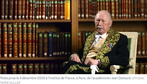 Quand il est mort en 2011, le journal Le Monde lui a rendu hommage en ces termes : « L’écrivain et académicien Jean Dutourd est mort à l’âge de 91 ans. Réactionnaire, provocateur, ronchon, il était devenu une figure familière de la littérature et des médias en brocardant pendant plus de cinquante ans le conformisme et la médiocrité de l’époque. Physique de grognard, avec pipe et moustaches, il était né en janvier 1920 à Paris. Mobilisé et fait prisonnier en 1940, il s’évade pour rejoindre la Résistance, où il est cofondateur du mouvement Libération-Sud. Arrêté une nouvelle fois en 1944, il s’évade à nouveau et participe à la libération de Paris.