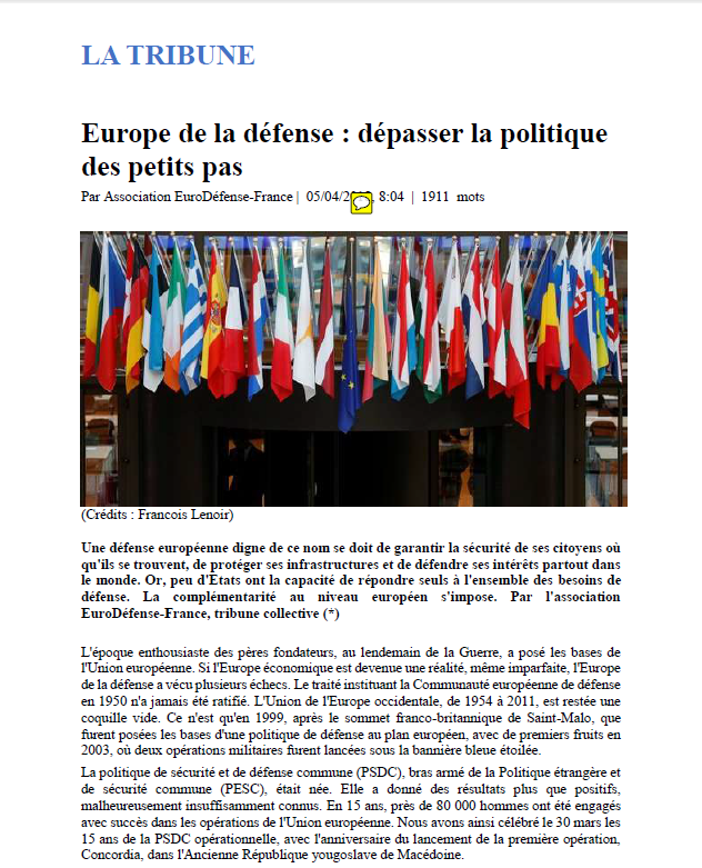 Jeudi dernier, le journal La Tribune et le blog Bruxelles 2 (B2Pro (1)) ont publié, sous le titre « Pour une défense européenne vraiment assumée. Dépasser la politique des petits pas, une nouvelle contribution d’EuroDéfense-France que je mets également en ligne.