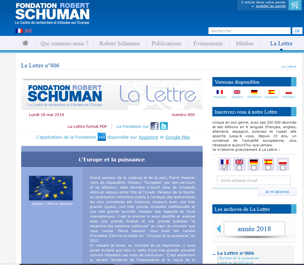 Après l’annonce de son décès, les hommages ont été nombreux. La Fondation Robert Schuman, dirigé par Jean-Dominique Giuliani, a mis en ligne un article publié dans le « rapport Schuman sur l’Europe, l’état de l’Union », Éditions lignes de repères, Paris, 2012, intitulé « L’Europe et la puissance » que Pierre Hassner avait écrit en 2012 (https ://www.robert-schuman.eu/fr/la-lettre/806). Au moment où l’Europe traverse une crise grave, ces réflexions sont également à relire.