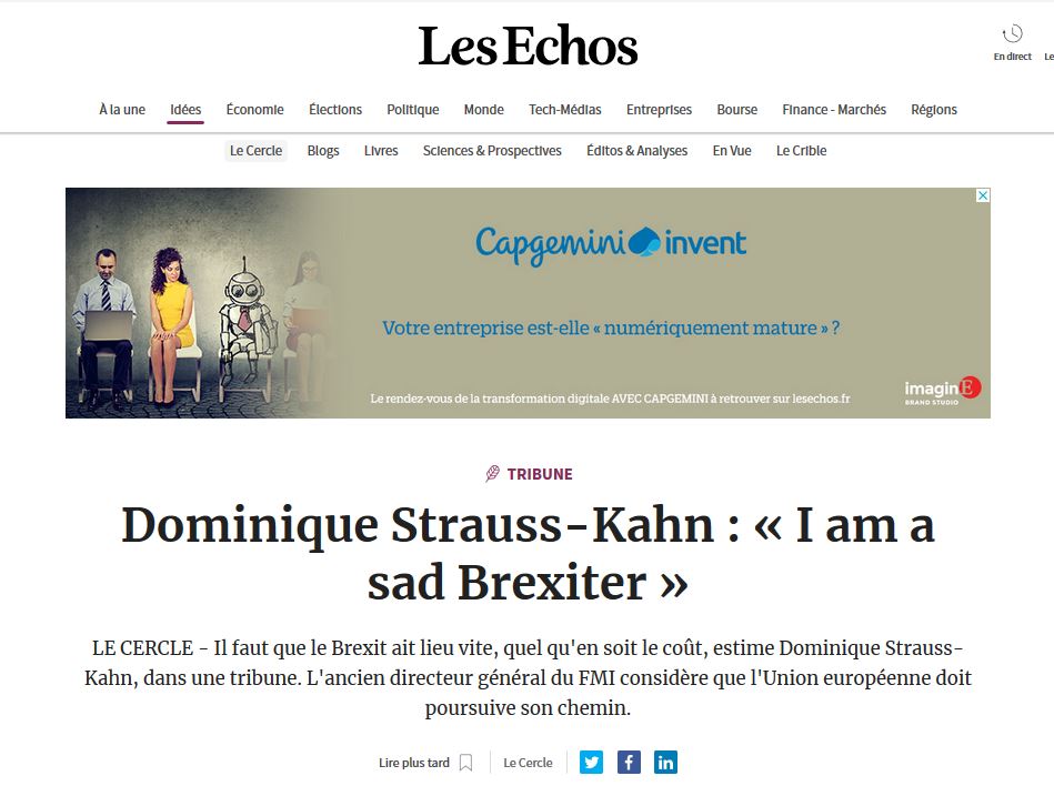 L’ancien directeur général du FMI souhaite que « le Brexit ait lieu vite, quel qu’en soit le coût, pour que l’Union européenne puisse reprendre le cours de sa construction. Les tergiversations ont assez duré. Elles produisent des dégâts qui pourraient se révéler irréparables aussi bien pour le Royaume Unie que pour l’Union européenne.