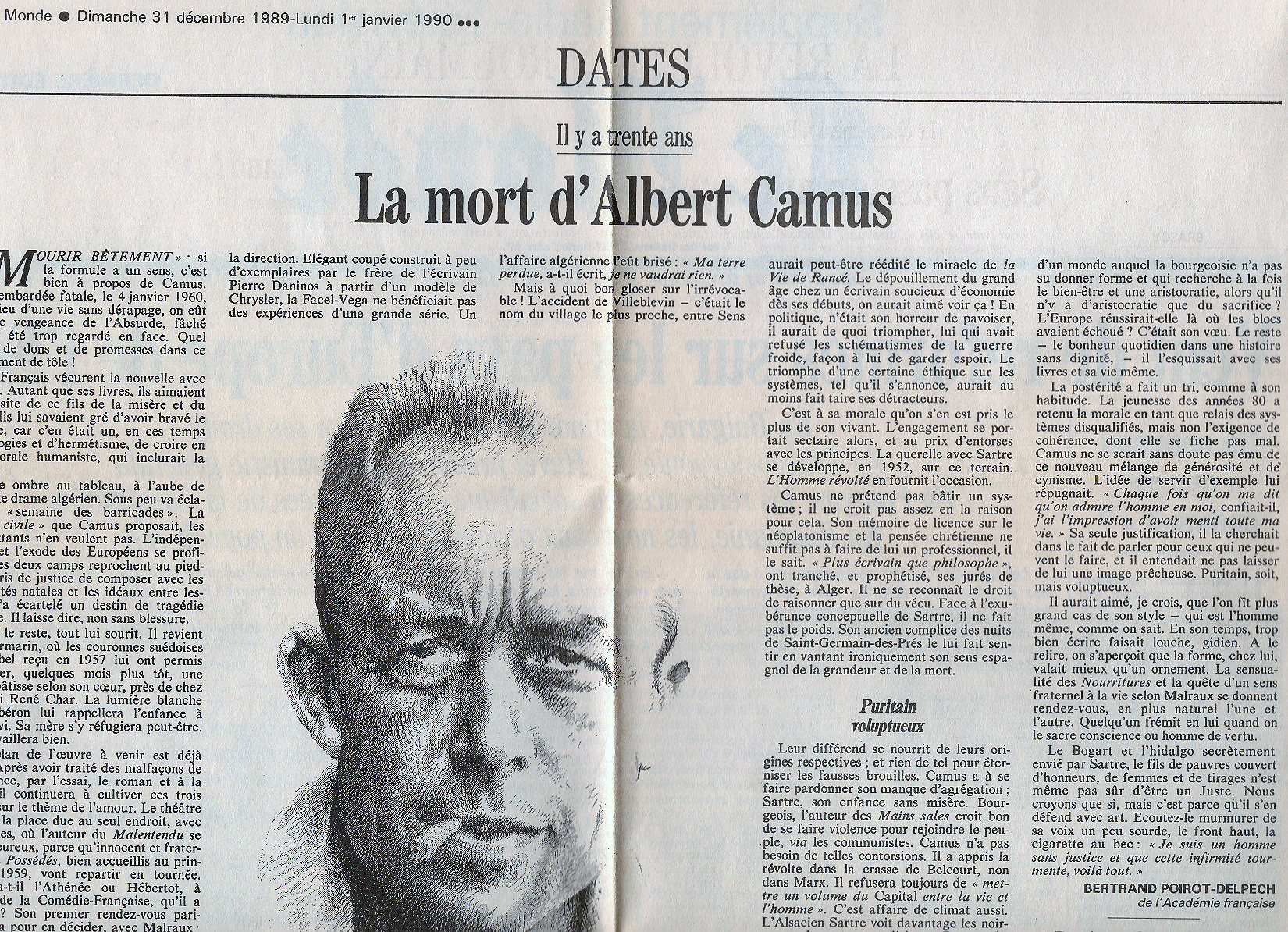 Le dimanche 31 décembre 1989, le journal Le Monde avait confié à Bertrand Poirot-Delpech, de l’Académie française, le soin de rendre hommage à Albert Camus à l’occasion du trentième anniversaire de sa disparition. L’académicien le fit avec beaucoup de talent. Je reproduis, ci-dessous, quelques passages de son article. Bertrand Poirot-Delpech ne savait pas, ce jour-là, que les Éditions Gallimard publieraient, cinq ans plus tard, « Le premier homme ».