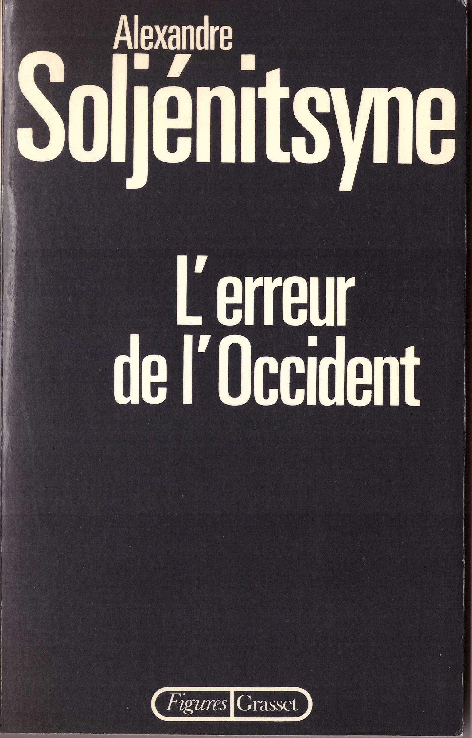 J’en étais à ce stade de mes réflexions, quand, tout à fait par hasard, mon regard s’est posé, dans ma bibliothèque, sur le livre d’Alexandre Soljénitsyne : « L’erreur de l’Occident », qui était en réalité un article écrit en février 1980, traduit du russe par Nikita Struve et publié aux USA dans Foreign Affairs dans son numéro d’avril 1980. La version française avait été publiée par Grasset dans la collection « Figures » dirigée par BHL.lerreur-de-loccident-de-soljenitsyne