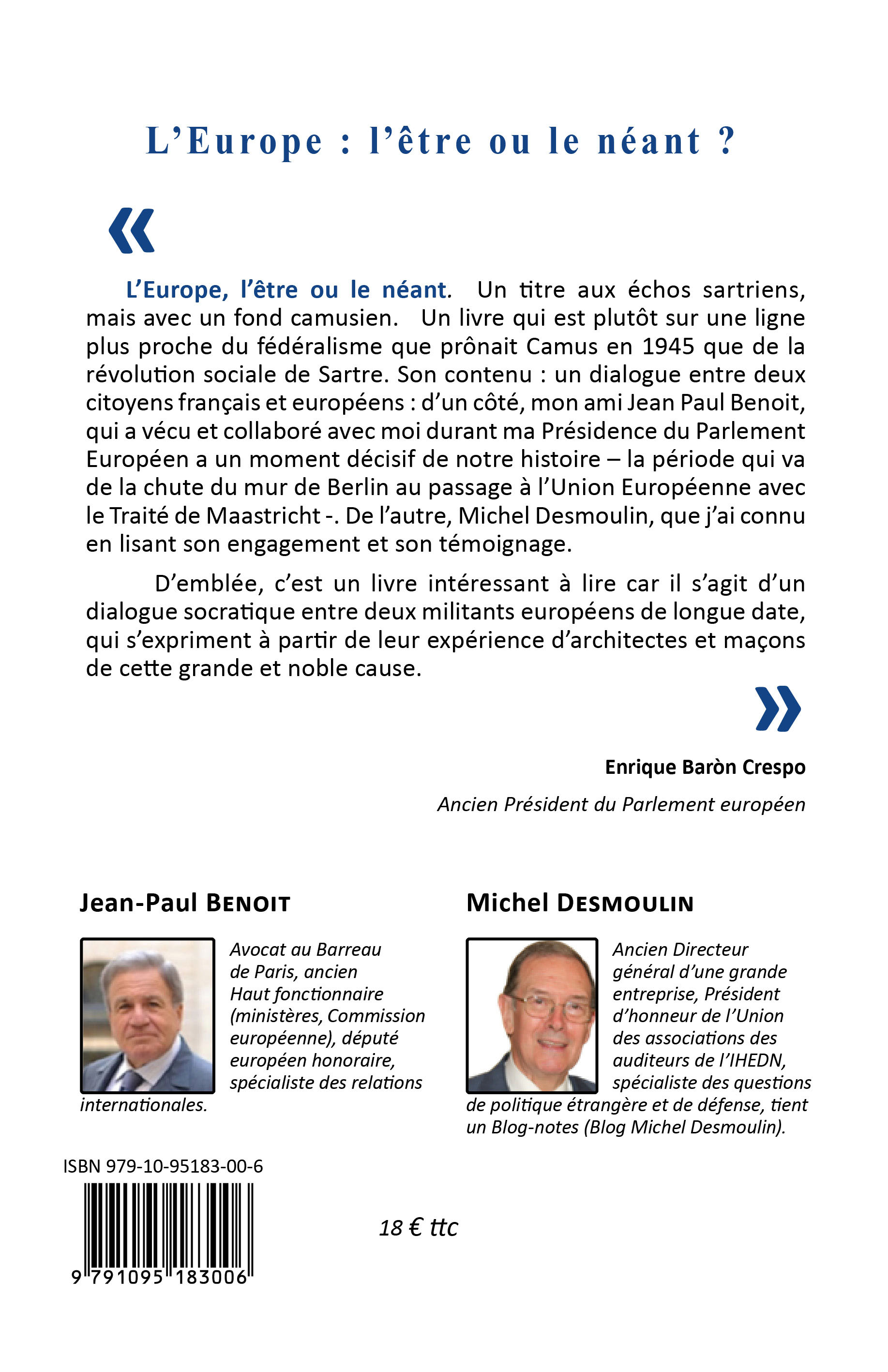 Enrique Baròn Crespo, ancien président du Parlement européen, a bien voulu signer la préface de cet essai. Sur le titre : « L’Europe, l’être ou le néant… », qui résume assez fidèlement l’optimisme et le pessimisme de nos propos respectifs et les enjeux, l’ancien ministre espagnol exprime son point de vue : « Un titre aux échos sartriens, mais avec un fond camusien. Un livre qui est plutôt sur une ligne plus proche du fédéralisme que prônait Camus en 1945 que de la révolution sociale de Sartre. »