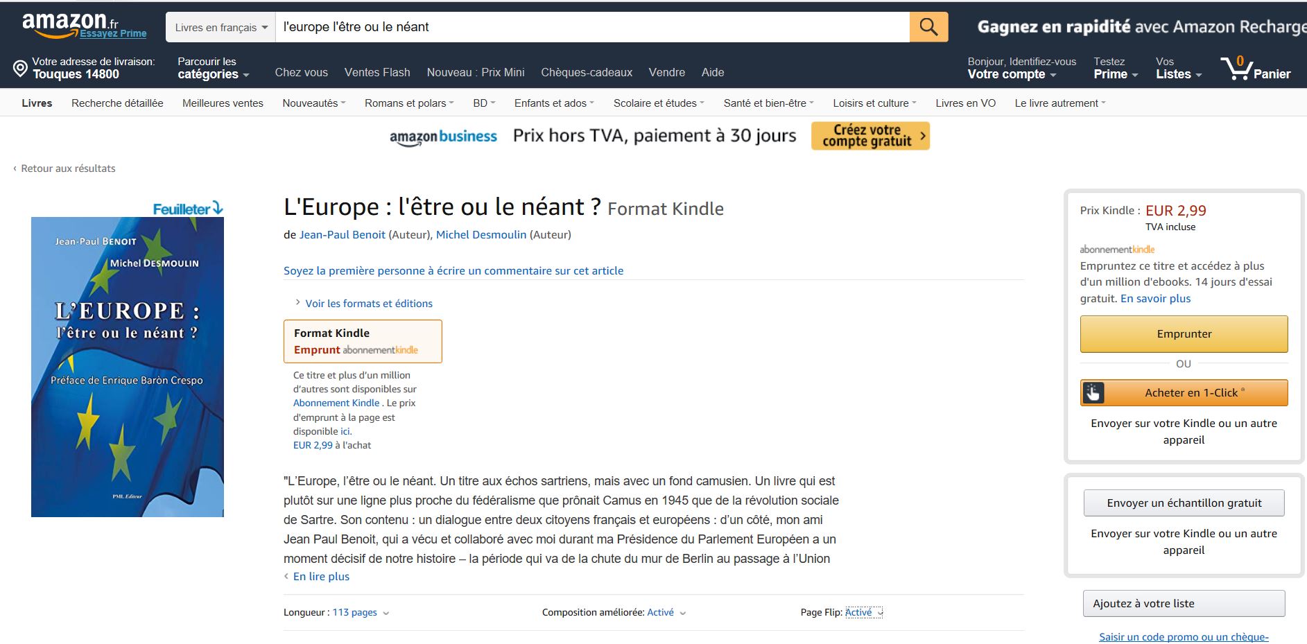 « L’Europe : l’être ou le néant ? » ISBN 979-10-95183-00-6 – 18€ – sera référencé par dilicom pour les librairies physiques et numériques et sur amazon dès aujourd’hui. Le livre peut également être acheté sur le site de l’éditeur :