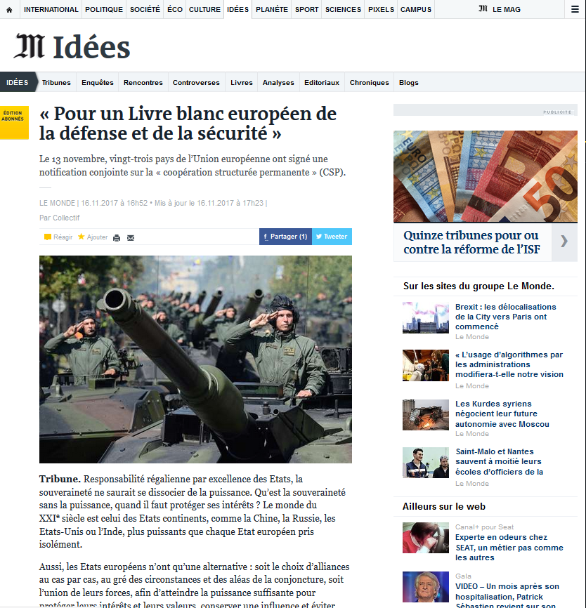 Le journal Le Monde publie aujourd’hui le plaidoyer d’EuroDéfense- France pour un livre blanc européen de la défense et de la sécurité. C’est le signe que les idées font leur chemin. C’est bien. C’est le but que s’était fixé notre ami Pierre Schwed, le fondateur du réseau EuroDéfense, avec notre soutien. Nous sommes un certain nombre à penser à lui. Ce n’est pas toujours un tort d’avoir raison trop tôt!