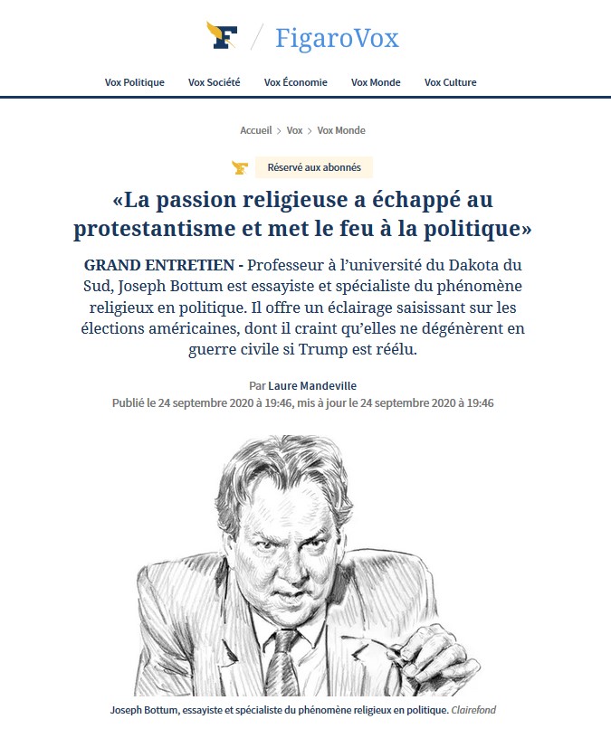 Laure Mandeville, grande reportrice au Figaro, ancienne correspondante du Figaro à Moscou, de 1997 à 2000, puis, de 2009 à 2016, à Washington, une des meilleures spécialistes des élections présidentielles américaines, a publié dans Le Figaro du 24 septembre 2020, l’entretien qu’elle a eu avec Joseph Bottum, Professeur à l’université du Dakota du Sud, essayiste et spécialiste du phénomène religieux en politique.