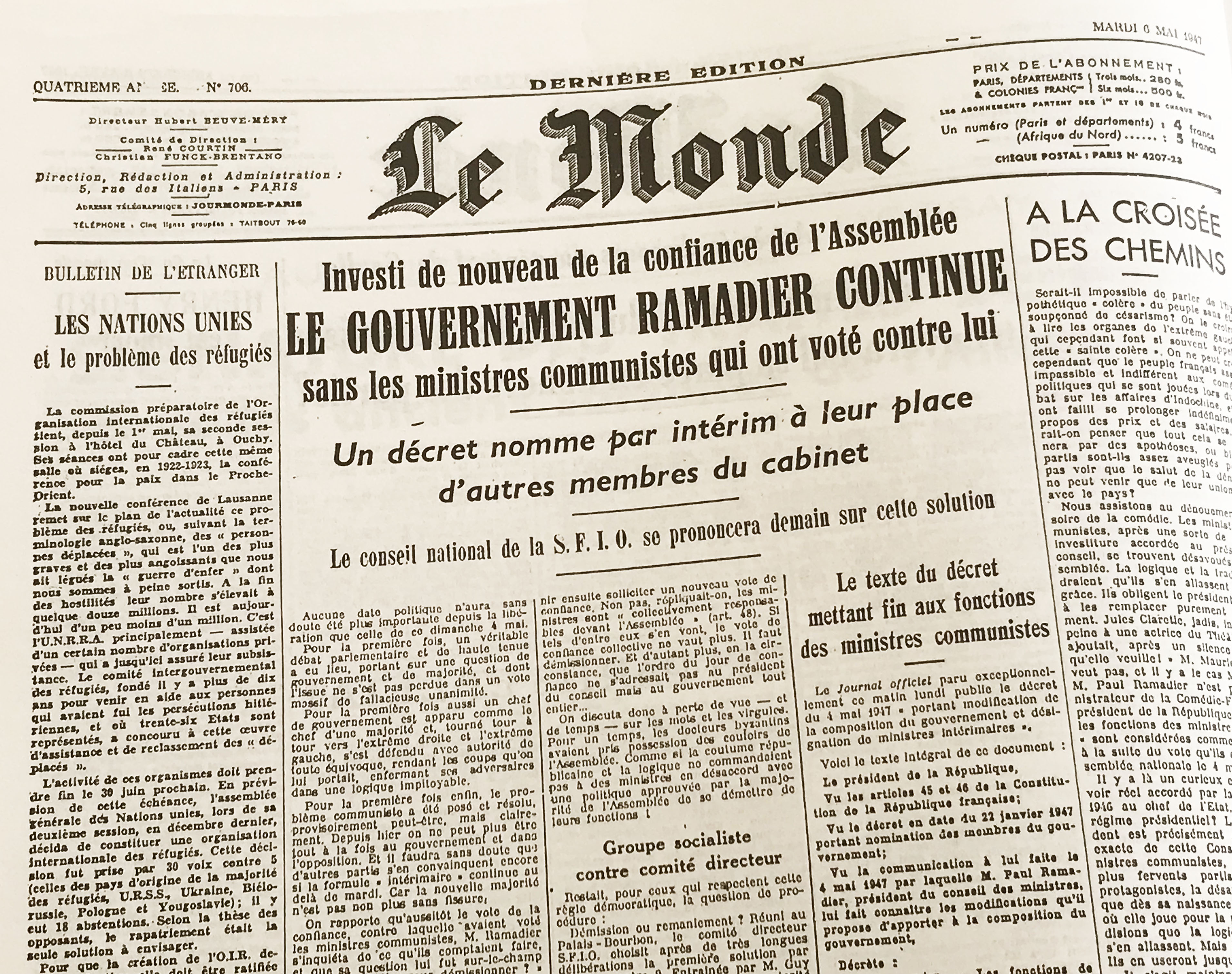 Dans ce contexte, le tripartisme du gouvernement ne pouvait que se disloquer. La crise politique ne pouvait qu’éclater. Les communistes contestaient toutes les décisions dans un environnement international préoccupant, notamment en Indochine. Au Palais-Bourbon, les discussions n’étaient qu’invectives et hurlements.